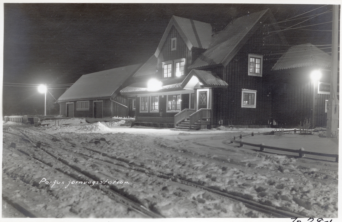 En snöig vy över Porjus Statiion.