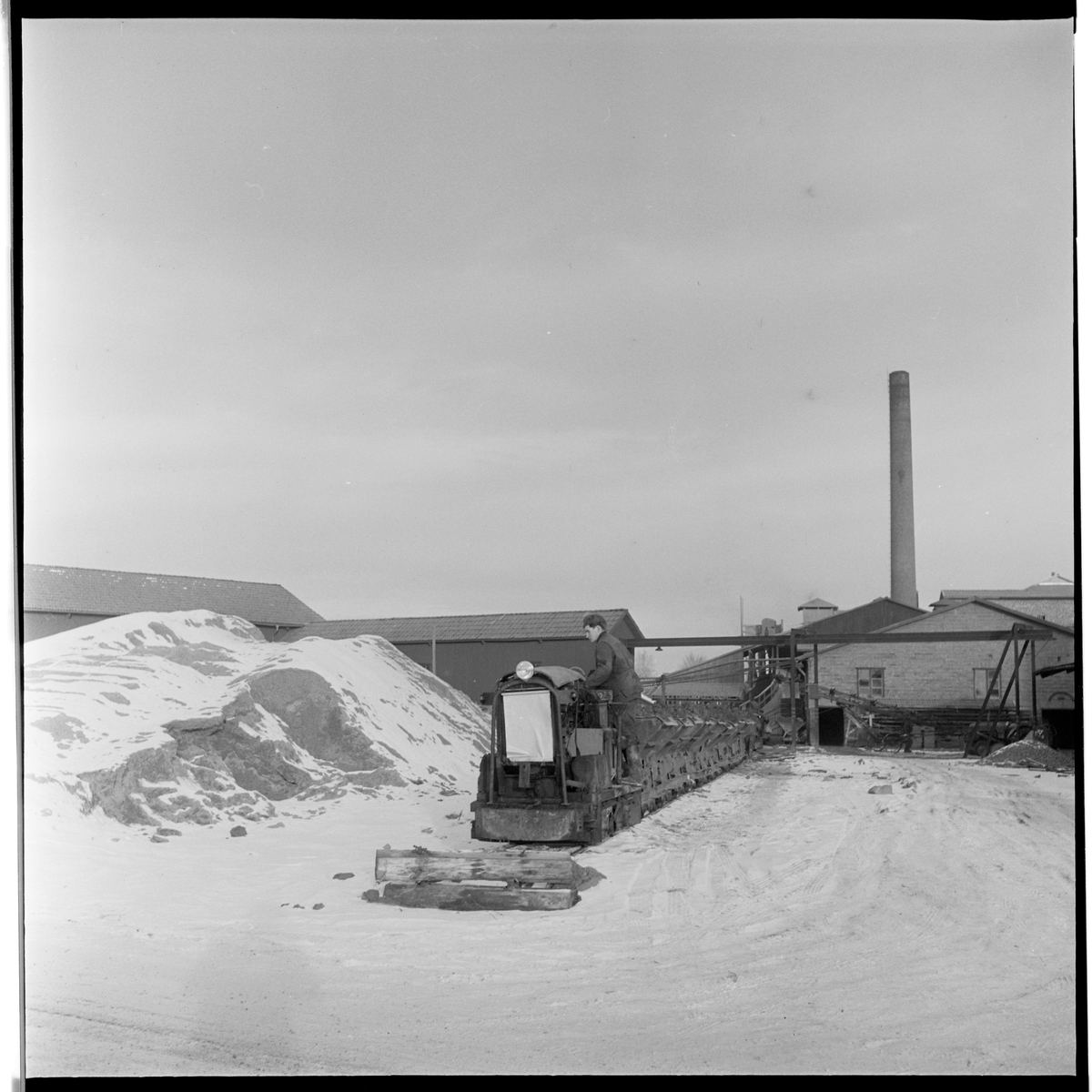 Ett bensinlok med godsvagnar vid en gruva.
