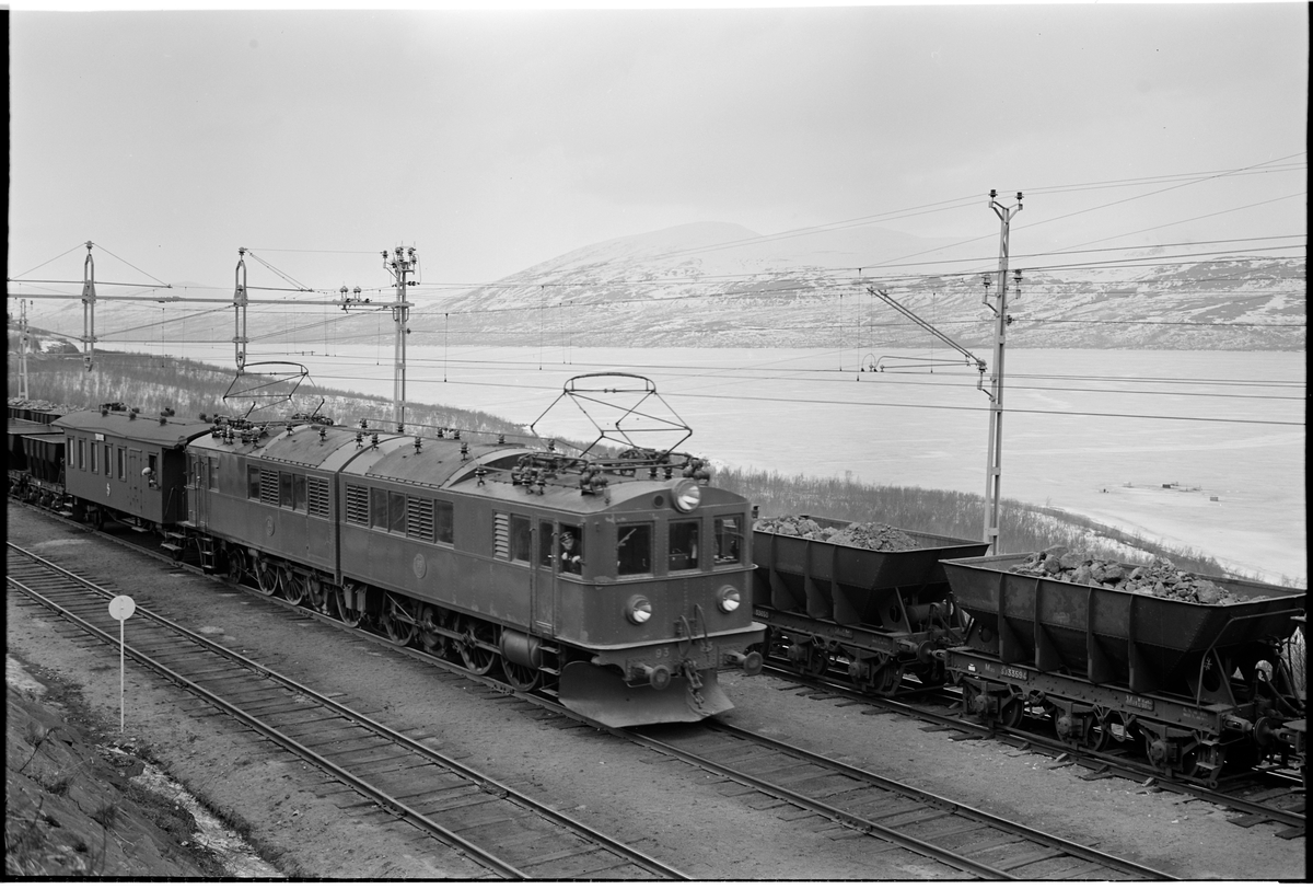 Multipelkopplade Of-lok, SJ Of 93 och SJ Of 94 med tomma malmvagnar möter ett fullastat malmtåg vid Kaisepakte mötesstation. Bland malmvagnara syns bl a SJ Mas 33594 och SJ Mas33650.