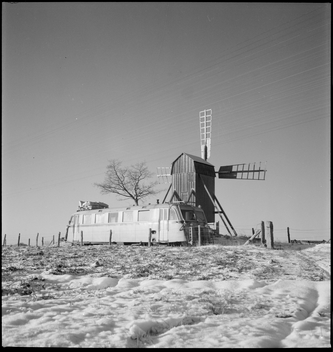 Gengasdriven rälsbuss på Ölands spår framför en väderkvarn.