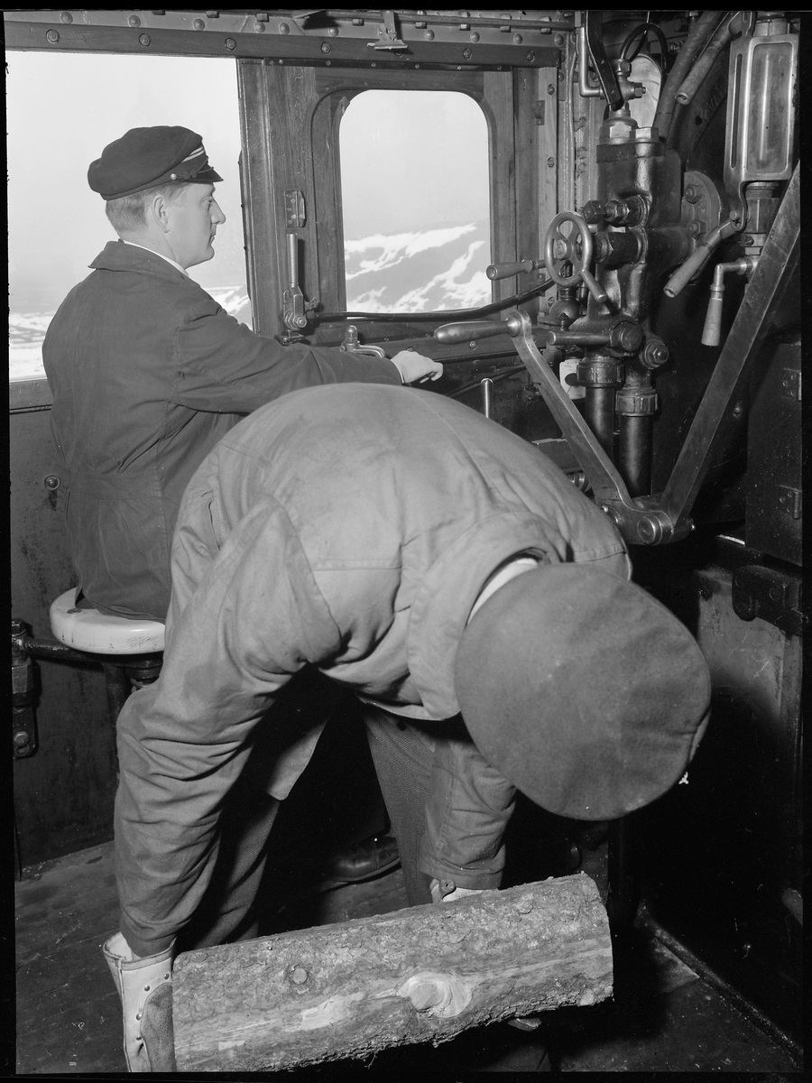 Lokförare och eldare i arbete ombord på ett ånglok.