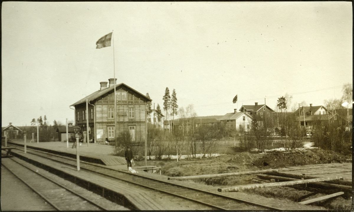Bastuträsk station. Statens Järnvägar, SJ. Banan öppnades 1894. Det första stationshuset före ombyggnaden 1909-1912. Banan Bastuträsk - Skellefeå öppnades 1912. Elektrifierades 1997.