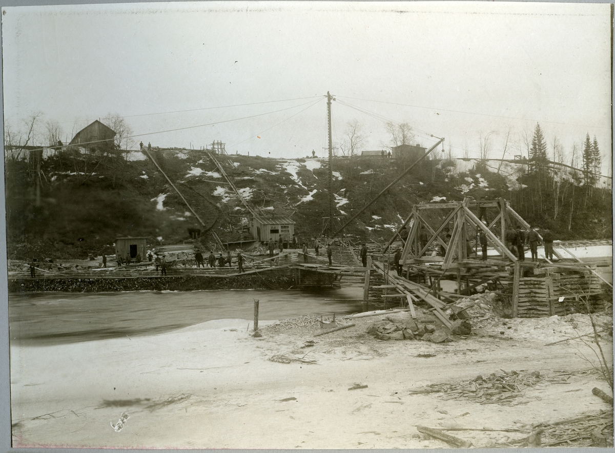 Slind. Statens Järnvägar, SJ. Brobygget över Skellefte älv i mars 1910.
