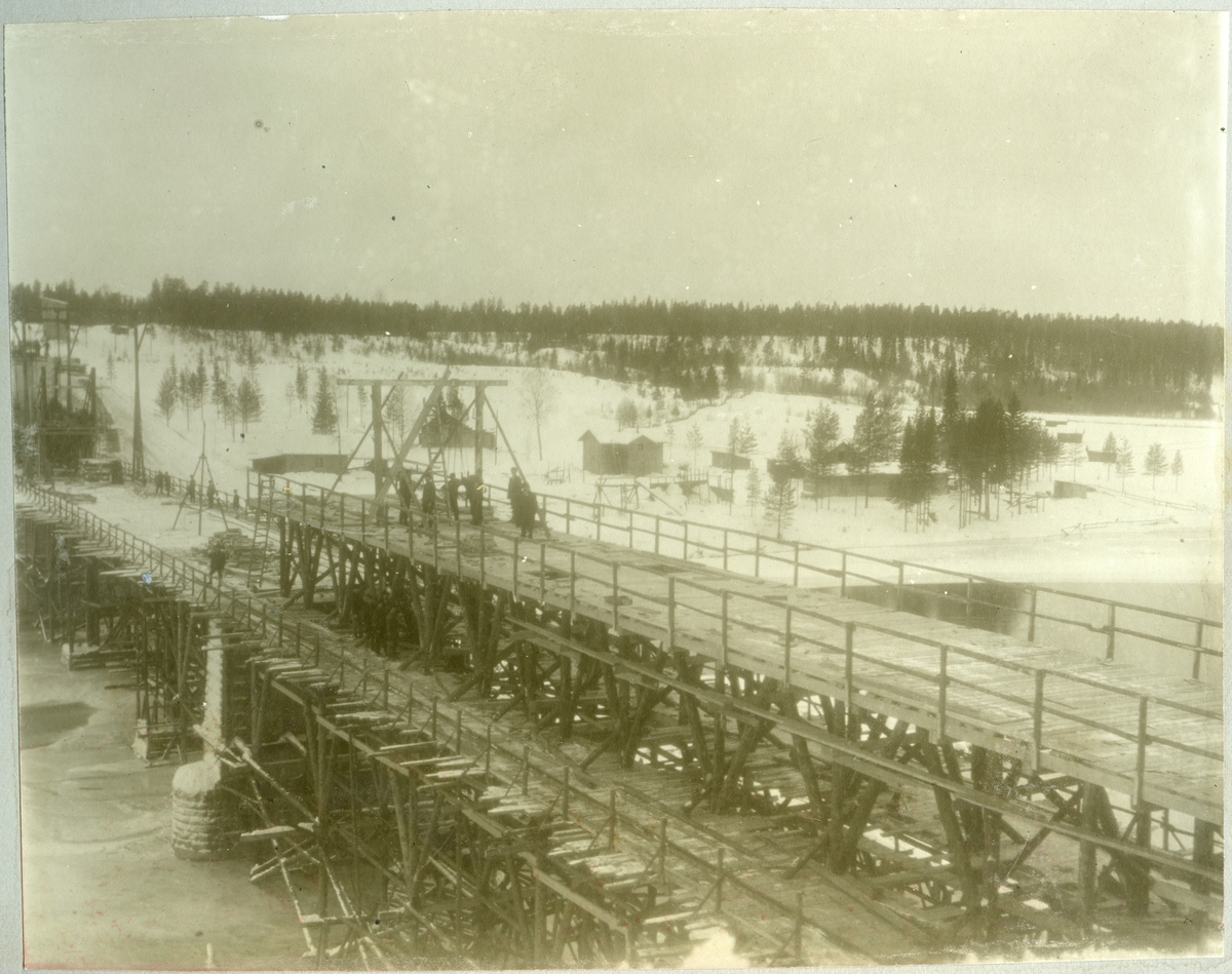 Slind. Statens Järnvägar, SJ. Brobygget över Skellefte älv i januari 1911.