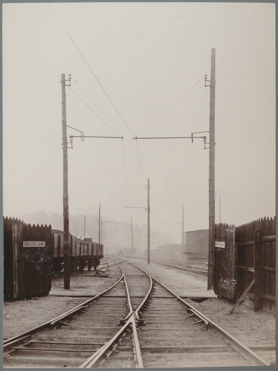 Försöksbanan Tomteboda - Värtan, delen mellan Albano och Värtan. Rörliga utliggare bär upp kontaktledningen.