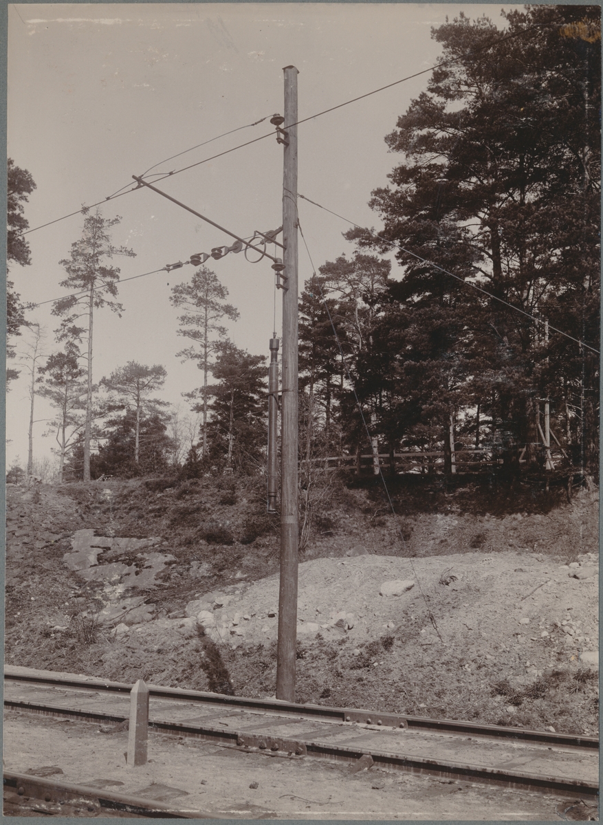 Försöksbanan Tomteboda - Värtan. Sträckan Albano - Värtan. Sträckvikt för kontaktledning. Kontaktledningsstolpe av trä.