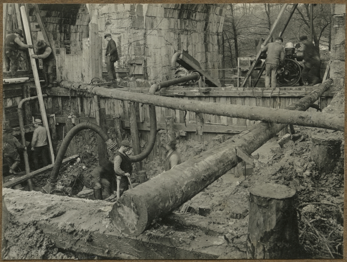 Dubbelspårsbyggnaden mellan Alingsås - Olskroken. Bron över Sveån södra bro halvan. Grundgrävning för östra landfästet.