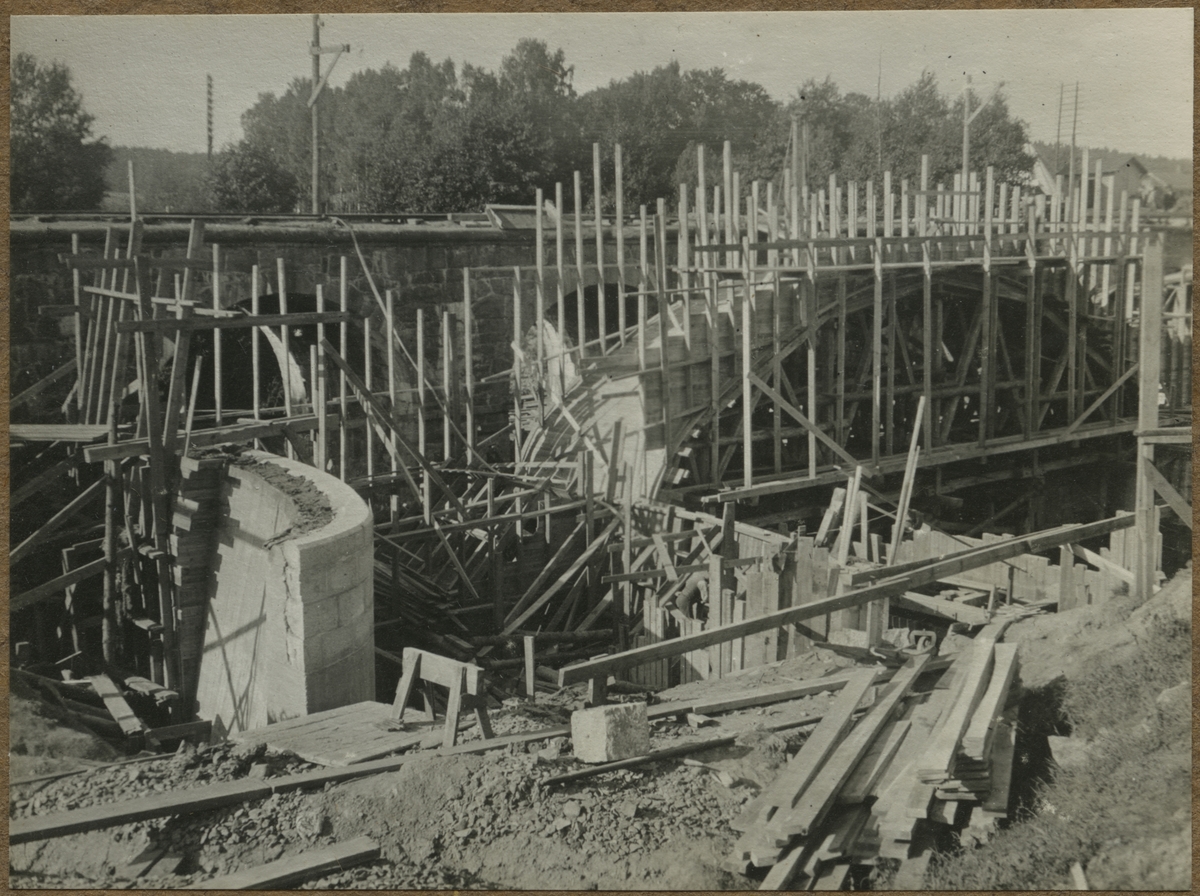 Dubbelspårsbyggnaden mellan Alingsås - Olskroken. Bron över Säveån södra brohalvan. Gjutformar uppsätts, gamla bron i bakgrunden.