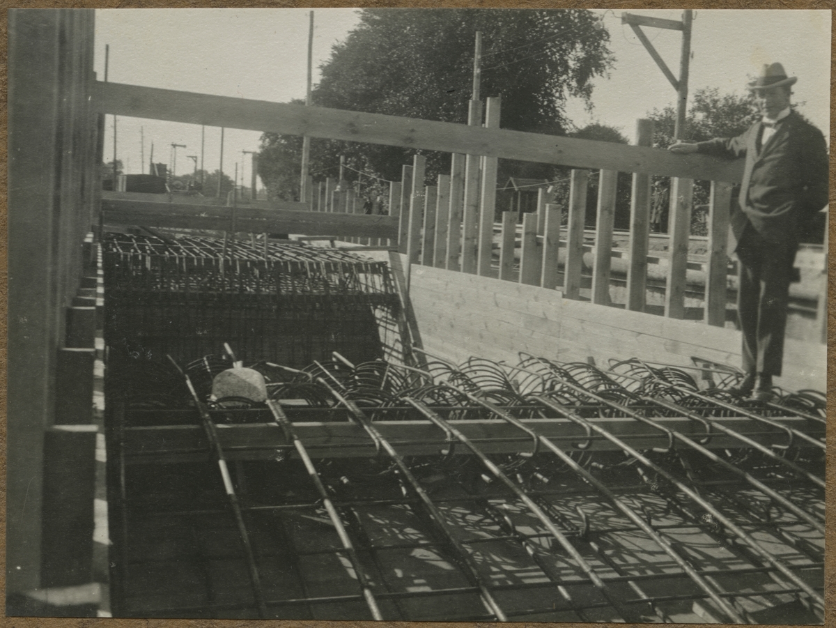 Dubbelspårsbyggnaden mellan Alingsås - Olskroken. Bron över Säveån södra brohalvan. Armeringsjärn inläggs för valvet.