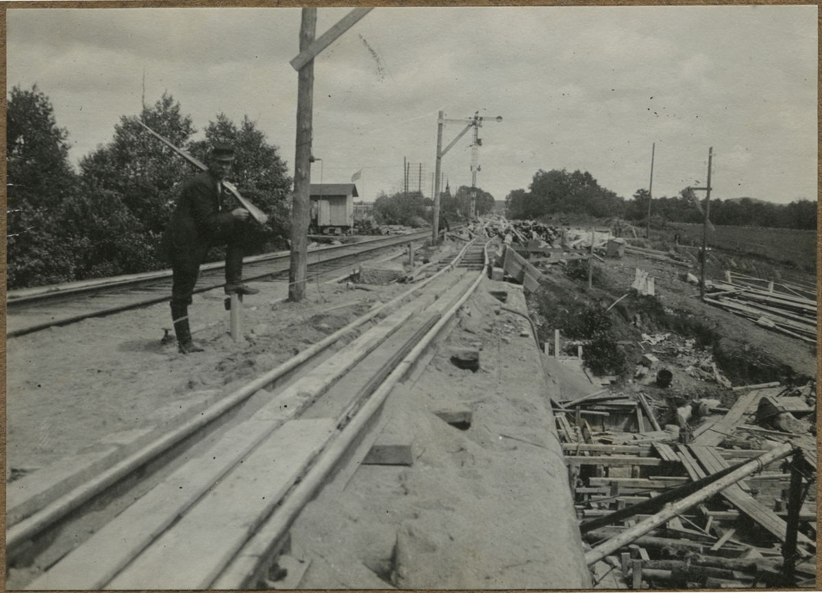 Dubbelspårsbyggnaden mellan Alingsås - Olskroken. Bron över Säveån södra brohalvan. Bevakningen av landstormen.