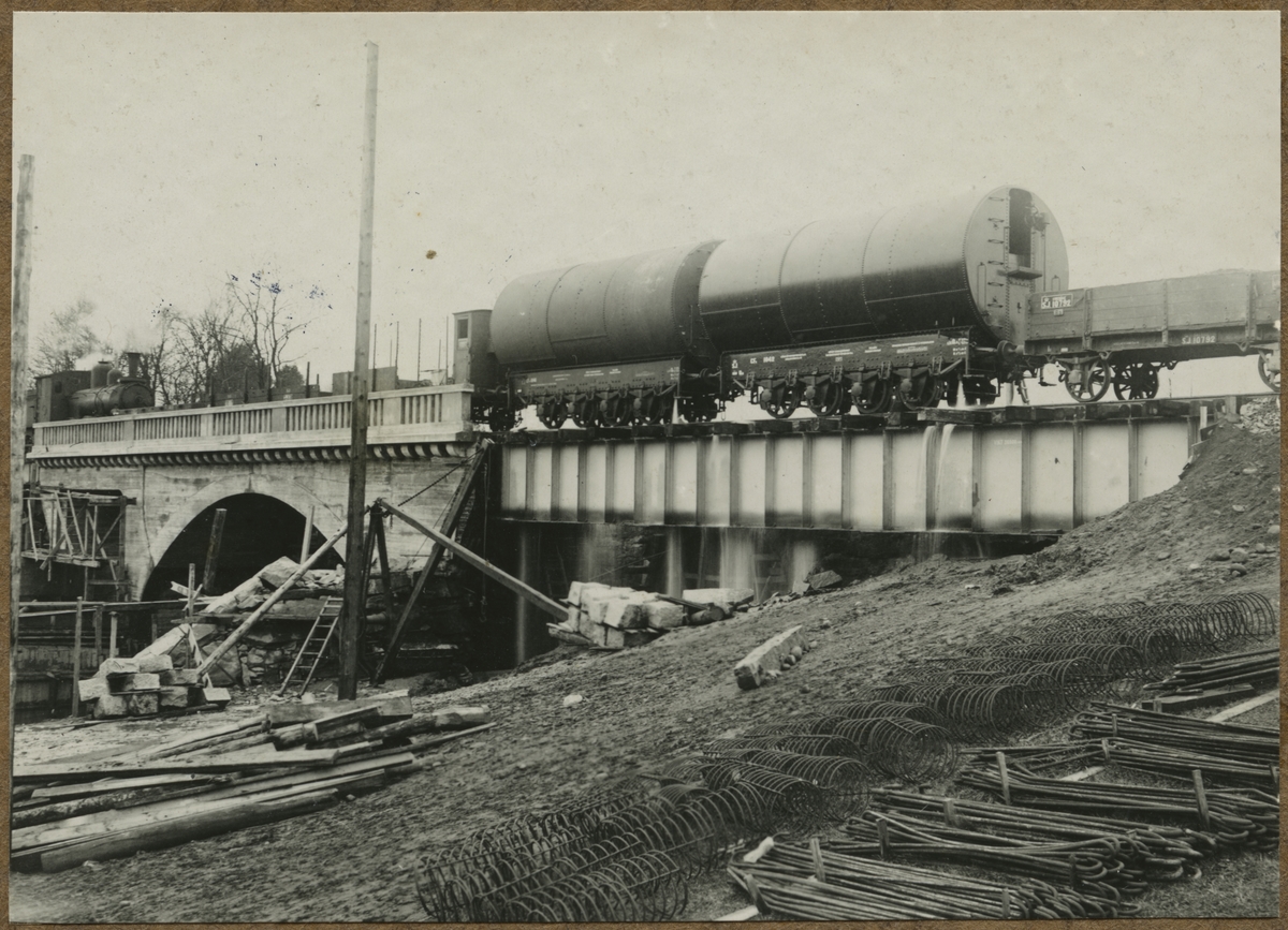 Dubbelspårsbyggnaden mellan Alingsås - Olskroken. Bron över Säveån södra brohalvan. Provbelastning. Godsvagn med tank SJ CF 1041, SJ CF 1042. Godsvagn SJ 10792 B3.