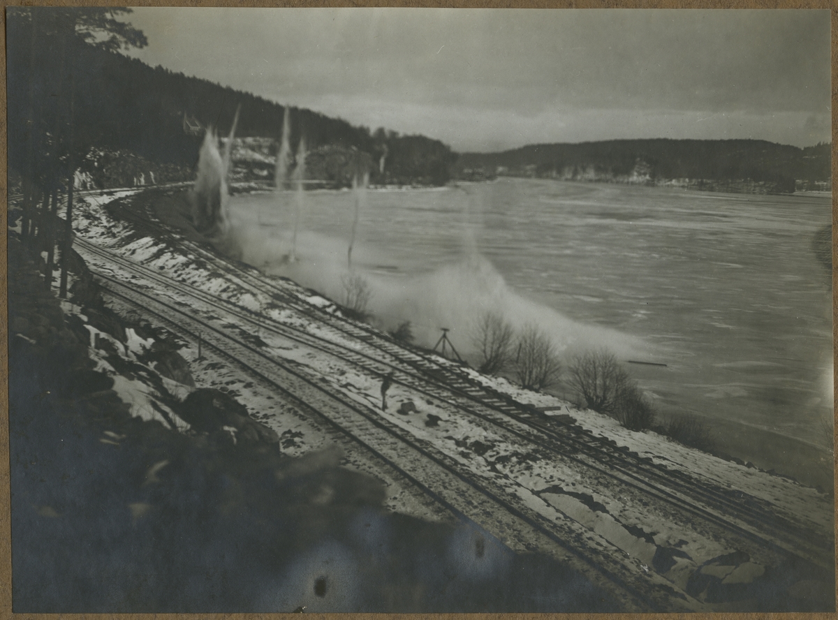 Dubbelspårsbyggnaden mellan Alingsås - Olskroken. Sprängning i den utfyllda banken vid stora Sävelången väster om Norsesunds station.