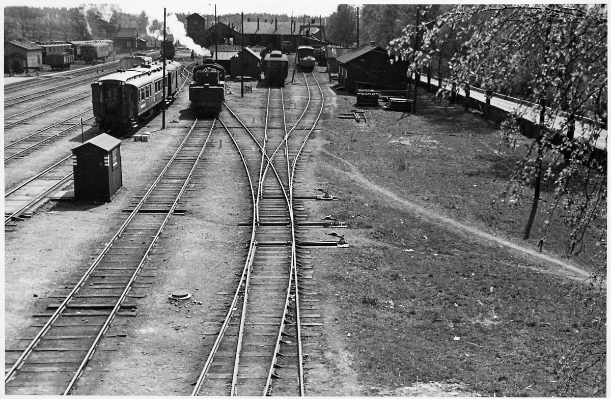 Bangården i Charlottenberg. Ångloket är troligen en B-maskin och vagnarna bredvid är AB03a 1080, SJs första restaurangvagn vilket syns på fönsterindelningen med alla