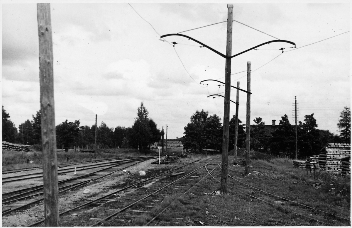 Till höger syns den elektrifierade smalspårsbanan Stockås-Mullhyttemo mellan Stockås torvströfabrik och Mullhyttemo station. Till vänster ser vi bangården vid Mullhyttemo station. Bilden tagen i samband med den stundande elektrifieringen av sträckan mellan Örebro-Svartå.