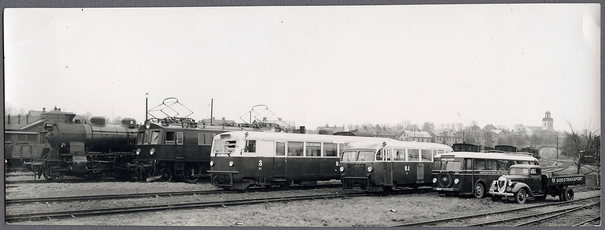 Titel: Fordonsuppställning vid Bergslagernas Järnvägar, BJ:s verkstäder i Åmål. Från vänster: BJ H3s 120, BJ Ds 201, BJ motorvagn 51, BJ motorvagn 4, BJ landsvägsbuss S 2012, BJ lastbil S 1120.