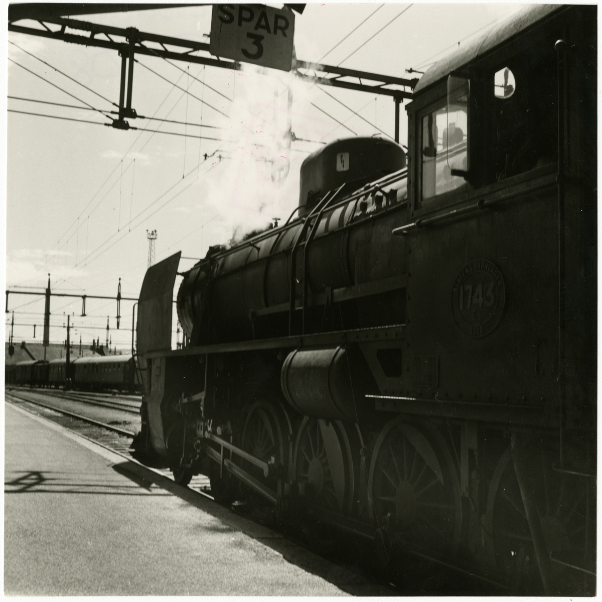 Östersund station och bangård i juni 1959. Statens Järnvägar, SJ. Ångloket är SJ E10 1743, tillverkningsår 1946.