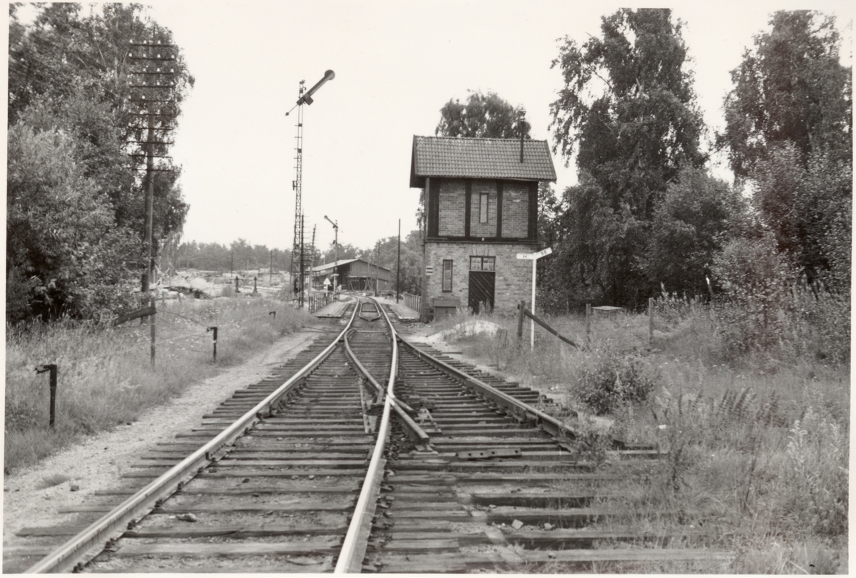 Södra änden av bangården, skylt står det H 98. Trafik började 1876, Pumpstation borttaget 1959.