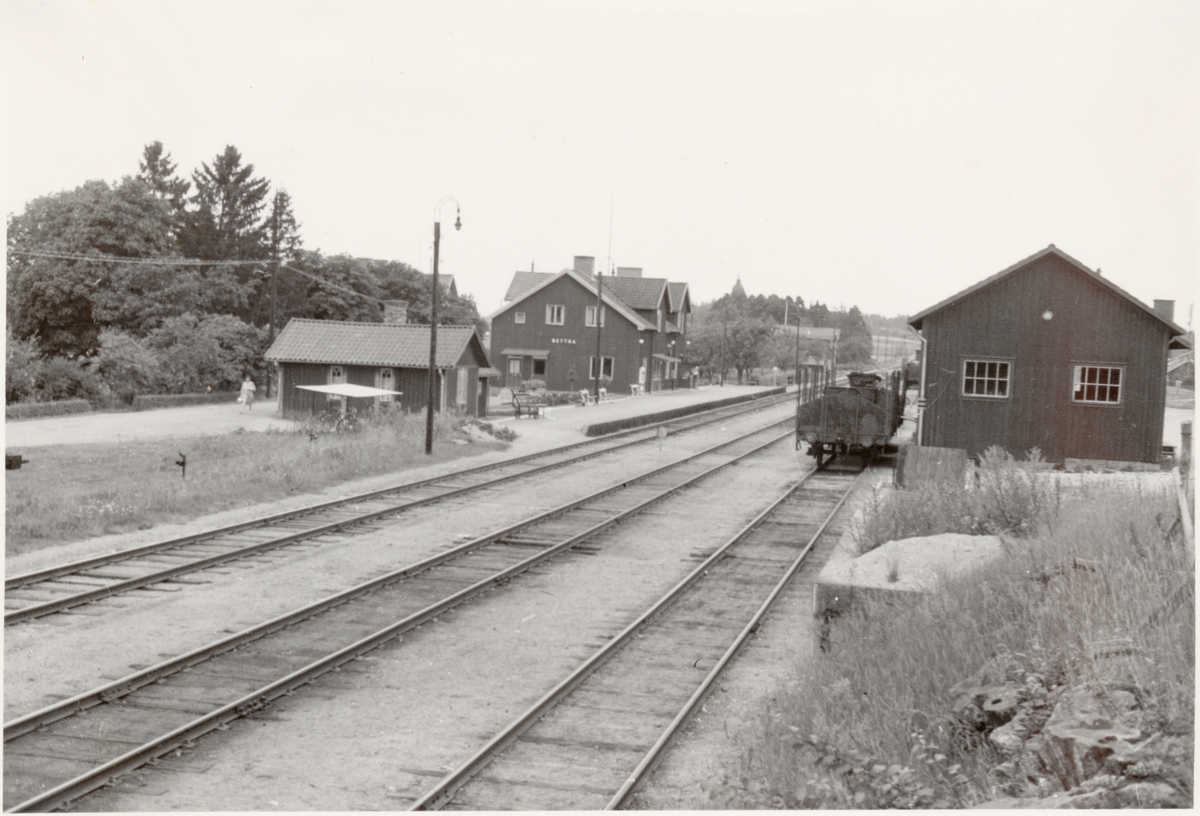 Stationen ligger till vänster och godsmagasinet till höger. Trafik började 1876, nedlagd 1981-05-31.