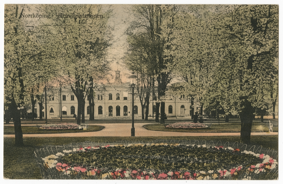 Kolorerat vykort av järnvägsstationen i Norrköping sett från gatusidan.