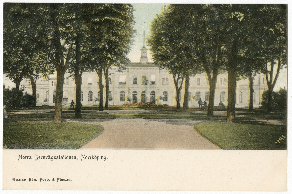 Kolorerat vykort av Norrköping station sett från gatusidan.