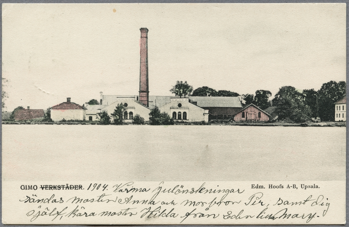 Handkolorerat vykort över Hammarsmedjan vid Gimo Bruk.