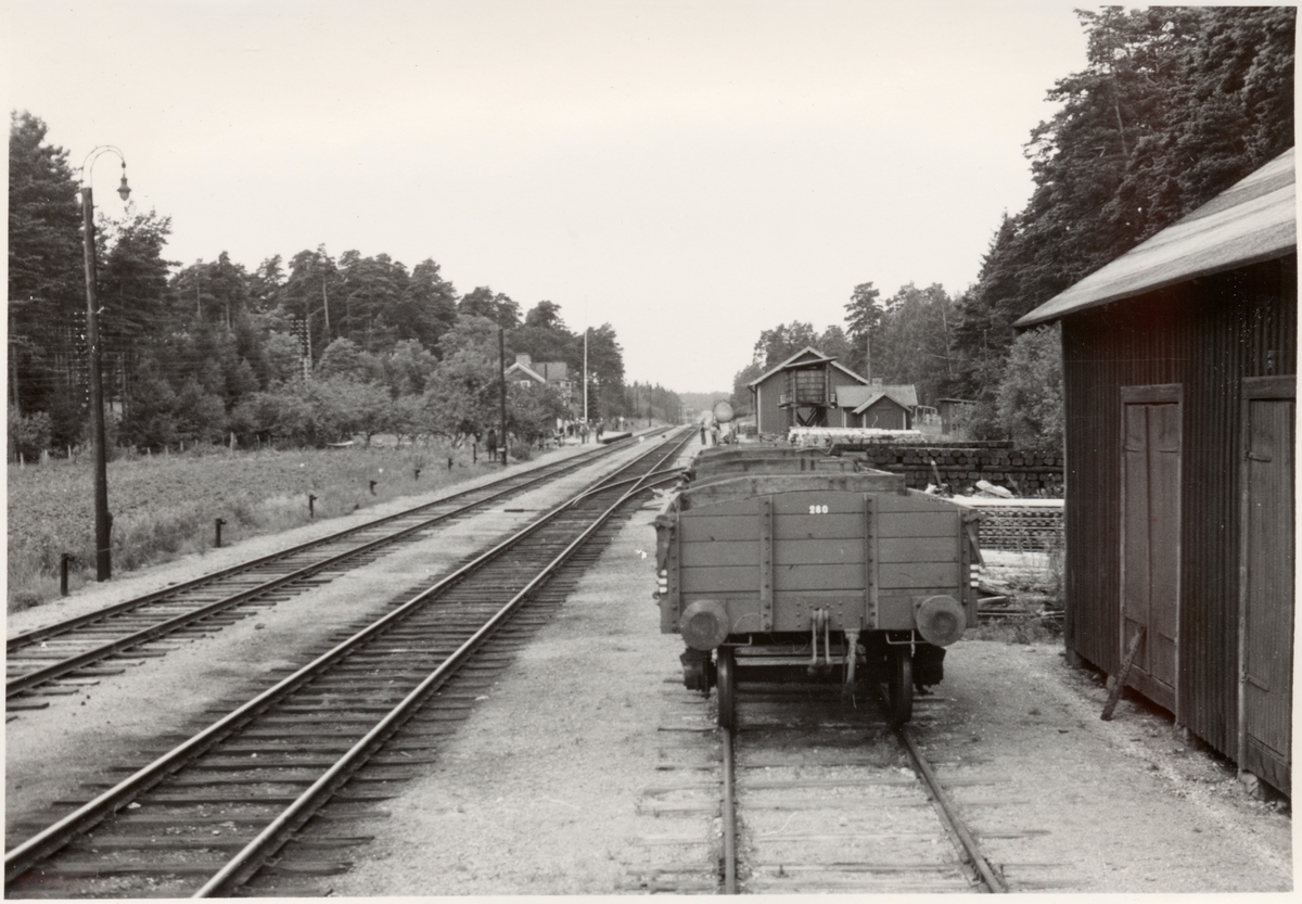 Magasin och godsvagn nummer 280. det ligger högar med slipers bakom godsvagnarna. Station öppnad 1876-07-01.