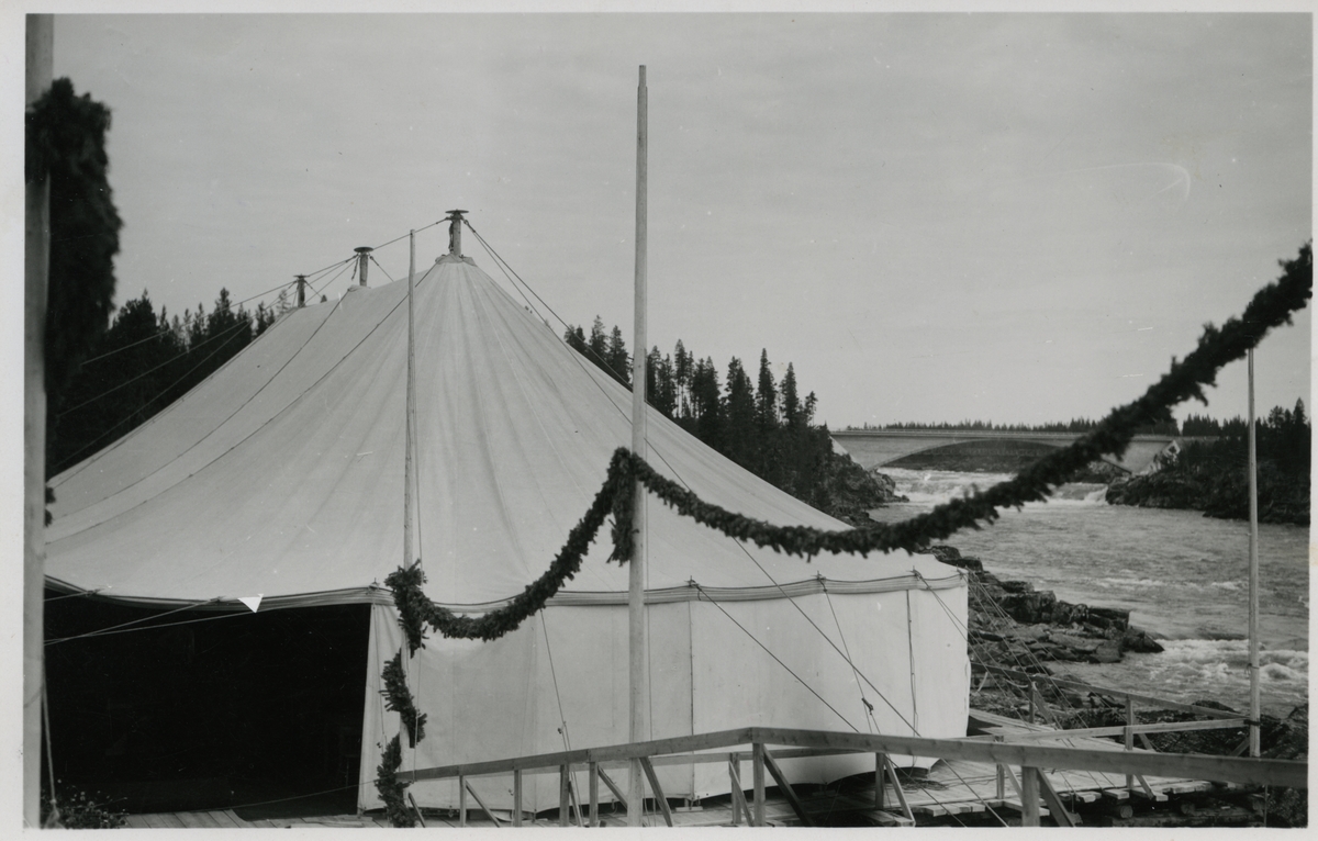 Middagstältet inför inlandsbanans invigning, uppbyggt vid Akkasfallen, strax norr om Jokkmokk.I bakgrunden syns bron över Lilla Luleälv.