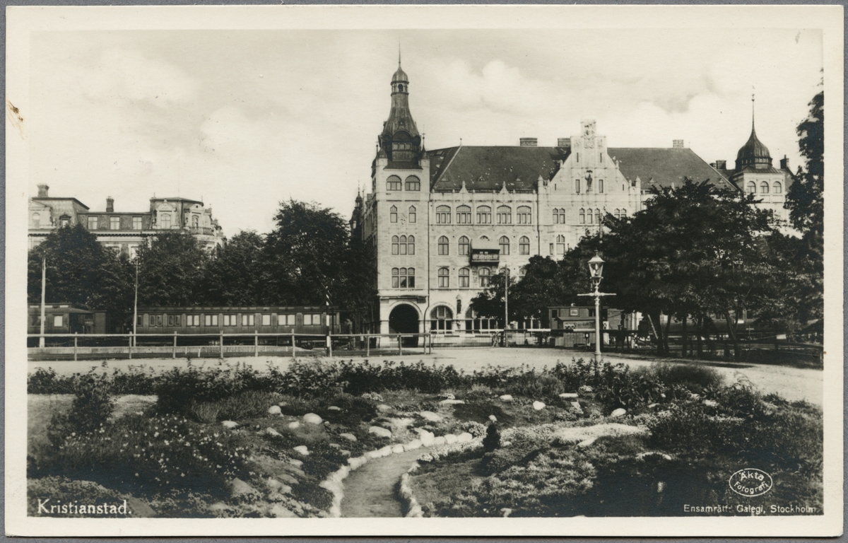Linje bild i Kristianstad med sparbankshuset i bild.