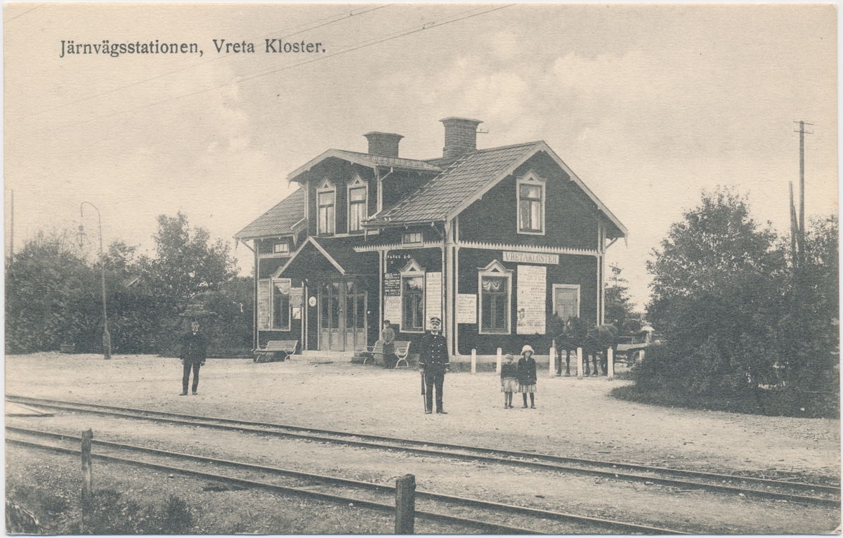 Vretat Kloster station. Mellersta - Östergötlands Järnväg, MÖJ. Banan öppnades 1897, elektrifiering 1915, övergick till Statens Järnvägar, SJ 1950 och banan stängdes 1963.