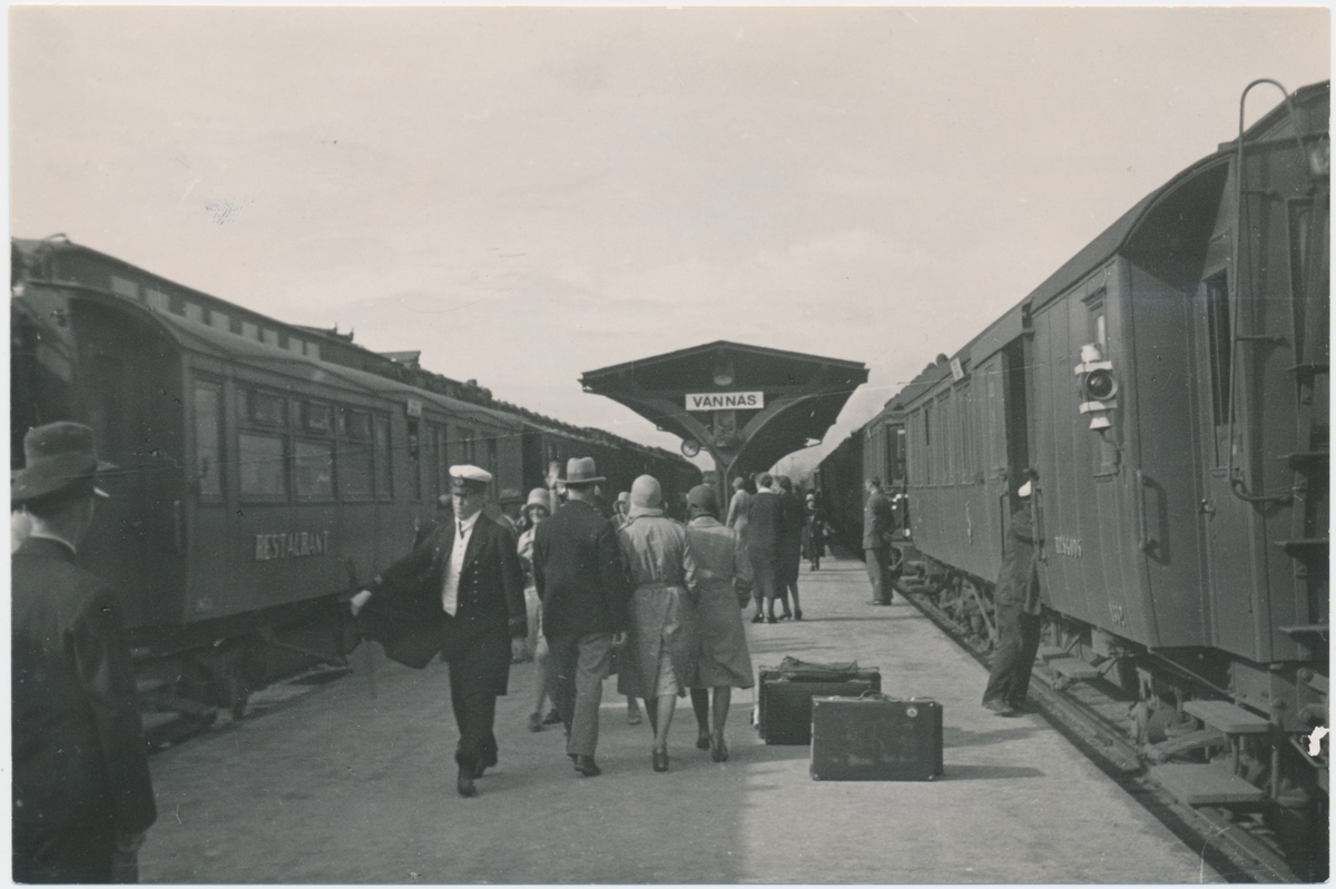 Vännäs station. SJ. Före elektrifieringen 1981. Statens Järnvägar, SJ. Stationen anlagd 1891. Stationshuset byggdes om 1927. Elektrifiering 1941. Blev k-märkt 1986. Restaurangvagn och personvagn där numret är oläsligt.