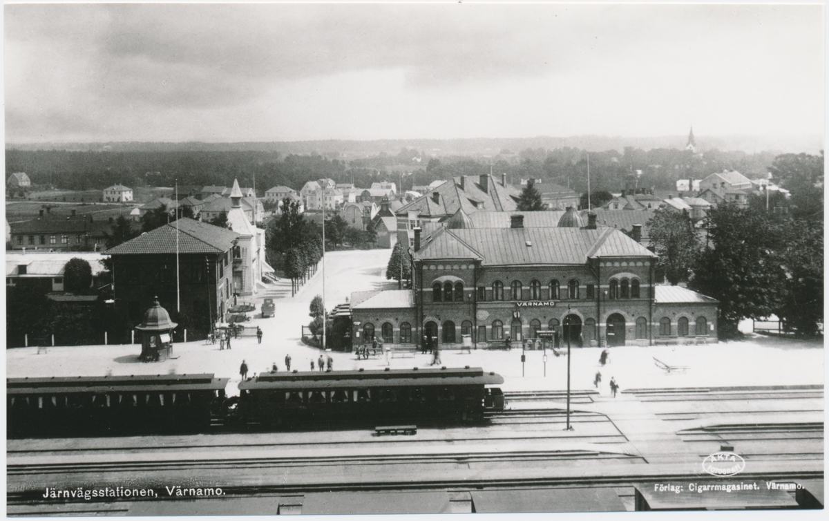 Värnamo station.Halmstad-Nässjö Järnväg, HNJ. Första stationshuset byggdes 1877 och revs 1995 för att det stod i vägen för en planerad vägkorsning. Första lokstallet byggdes 1875 men revs 1894 och ett nytt byggdes på annan plats på bangården. Ett nytt stationshus byggdes 1899 av Skånes-Smålands Järnväg, SSJ men byggnaden användes aldrig som järnvägsstation då SSj och HNJ enades om att använda HNJ station. 1902 byggdes ett nytt gemensamt stationshus vid godsmagasinet. 1903 anslöts Borås- Alvesta, BAJ hit och då byggdes ett nytt godsmagasin som bekostades av BAJ. Detta magasin tillbyggdes 1918 och 1935. HNJs gamla stationshus flyttades 1902 och blev bostads- och överliggningshus.