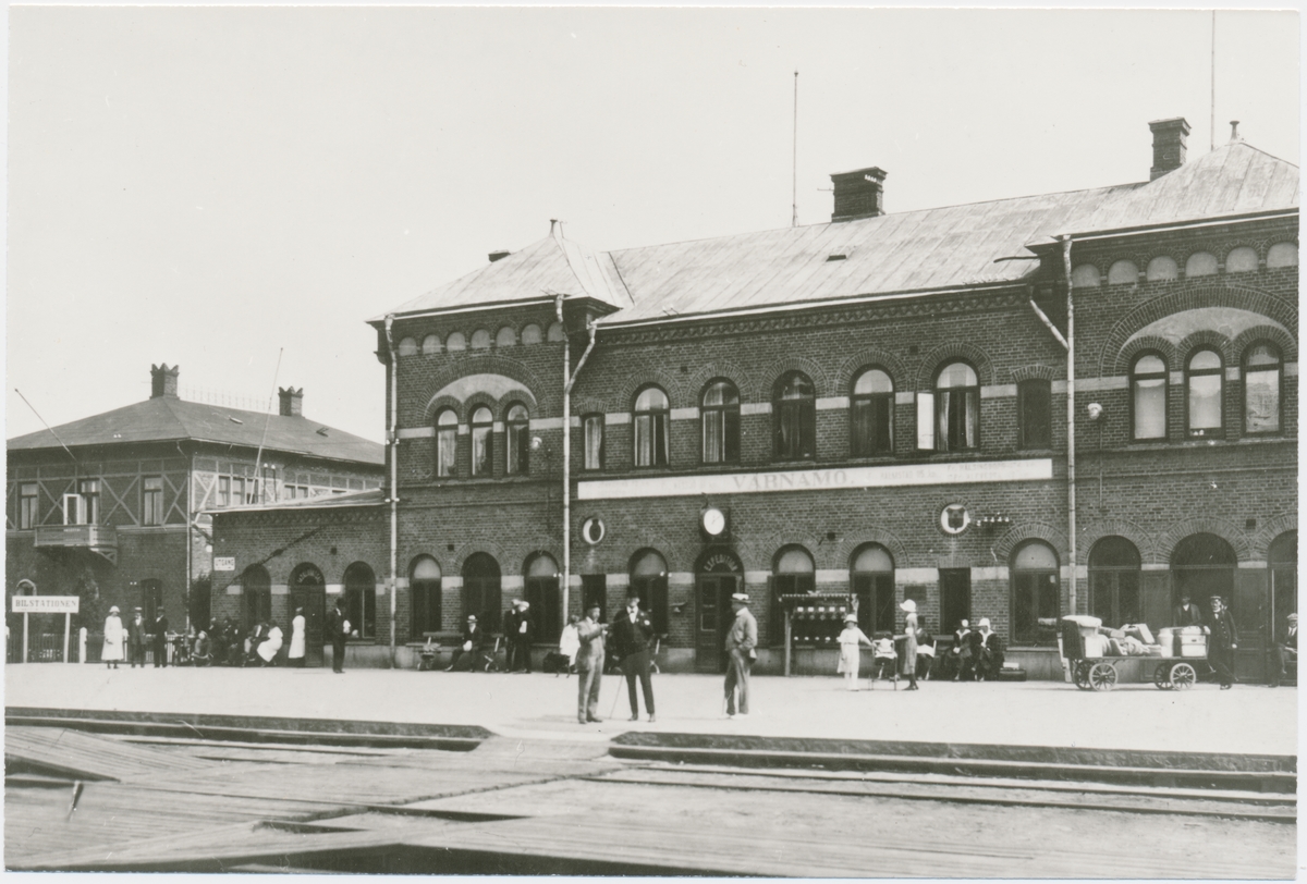 Värnamo station.Halmstad-Nässjö Järnväg, HNJ. Första stationshuset byggdes 1877 och revs 1995 för att det stod i vägen för en planerad vägkorsning. Första lokstallet byggdes 1875 men revs 1894 och ett nytt byggdes på annan plats på bangården. Ett nytt stationshus byggdes 1899 av Skånes-Smålands Järnväg, SSJ men byggnaden användes aldrig som järnvägsstation då SSj och HNJ enades om att använda HNJ station. 1902 byggdes ett nytt gemensamt stationshus vid godsmagasinet. 1903 anslöts Borås- Alvesta, BAJ hit och då byggdes ett nytt godsmagasin som bekostades av BAJ. Detta magasin tillbyggdes 1918 och 1935. HNJs gamla stationshus flyttades 1902 och blev bostads- och överliggningshus.