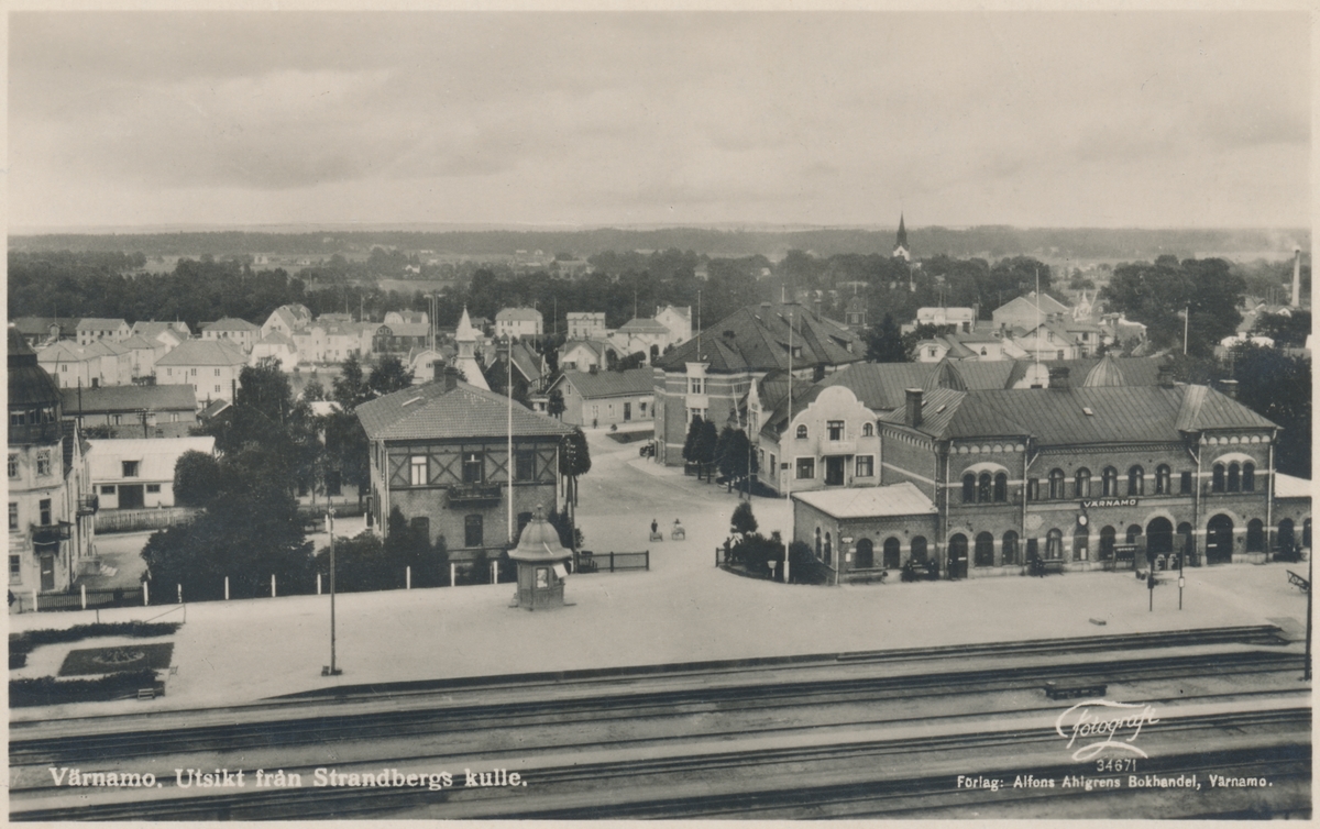 Värnamo station. Utsikt från Strandbergs kulle. Halmstad-Nässjö Järnväg, HNJ. Första stationshuset byggdes 1877 och revs 1995. för att det stod i vägen för en planerad vägkorsning. Första lokstallet byggdes 1875 men revs 1894 och ett nytt byggdes på annan plats på bangården. Ett nytt stationshus byggdes 1899 av Skånes-Smålands Järnväg, SSJ men byggnaden användes aldrig som järnvägsstation då SSj och HNJ enades om att använda HNJ station. 1902 byggdes ett nytt gemensamt stationshus vid godsmagasinet. 1903 anslöts Borås- Alvesta, BAJ hit och då byggdes ett nytt godsmagasin som bekostades av BAJ. Detta magasin tillbyggdes 1918 och 1935. HNJs gamla stationshus flyttades 1902 och blev bostads- och överliggningshus.