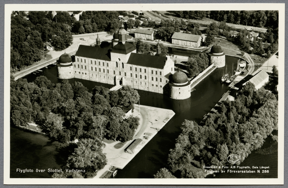 Vy över slottet i Vadstena med stationshuset i högra hörnet.