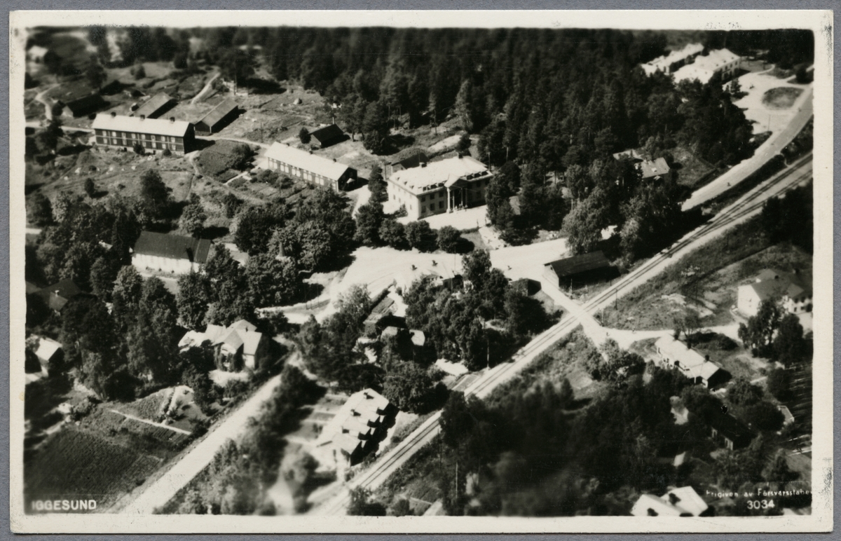 Flygfoto över Iggesund med spår och Iggesund bruks gamla huvudkontor i bild.