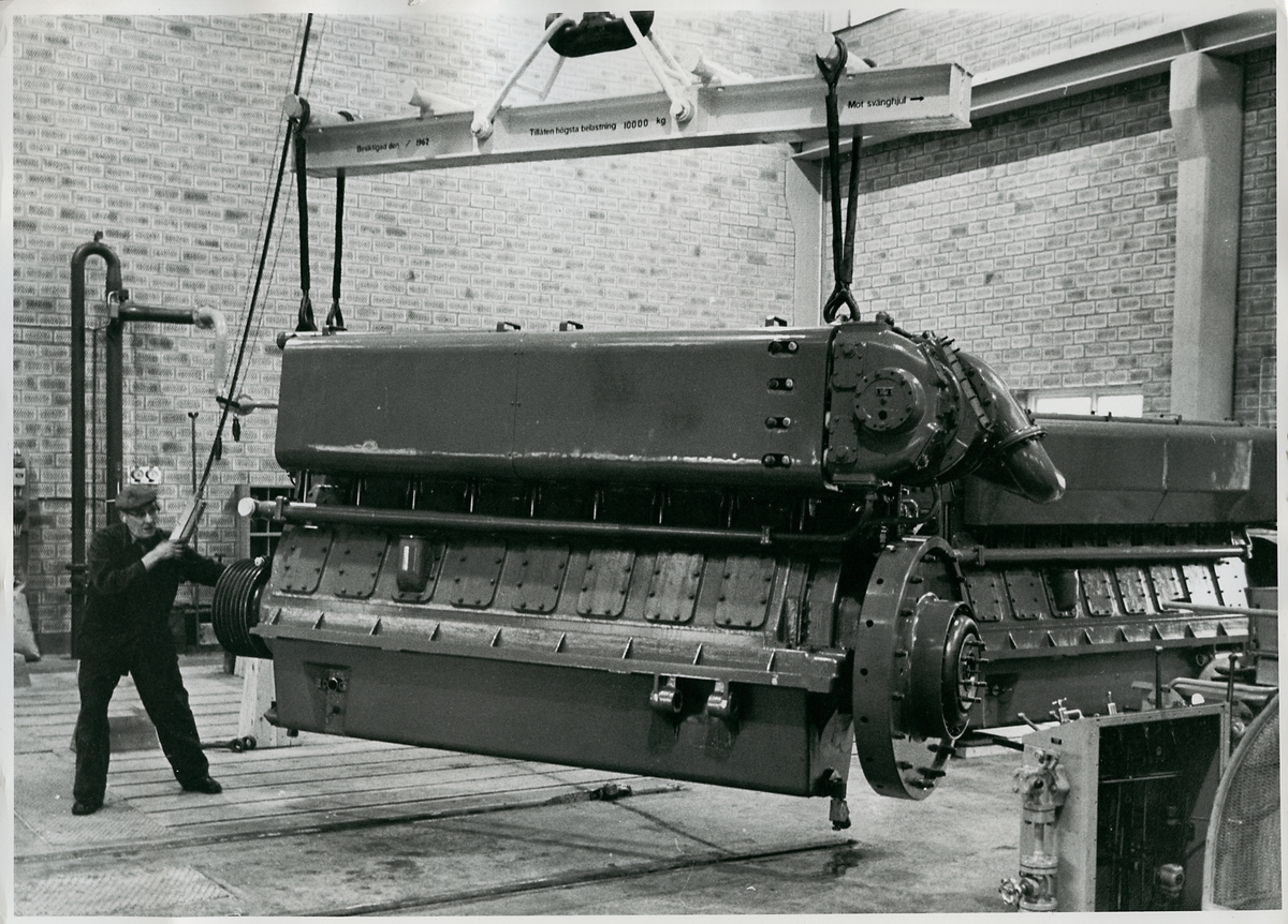 Dieselmotorn lyfts ur av traversen efter provkörning i provbänken.