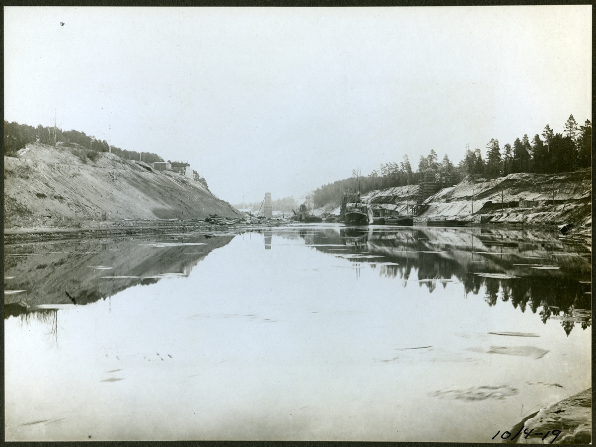 Brobygge för dubbelspåret över kanalen mellan Rönninge - Ström. Ångbåten Gamleby. 1892 - 1945