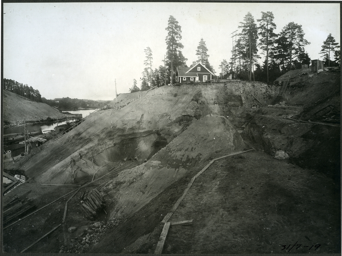 Markarbete vid brobygget för dubbelspåret över kanalen mellan Rönninge - Ström.