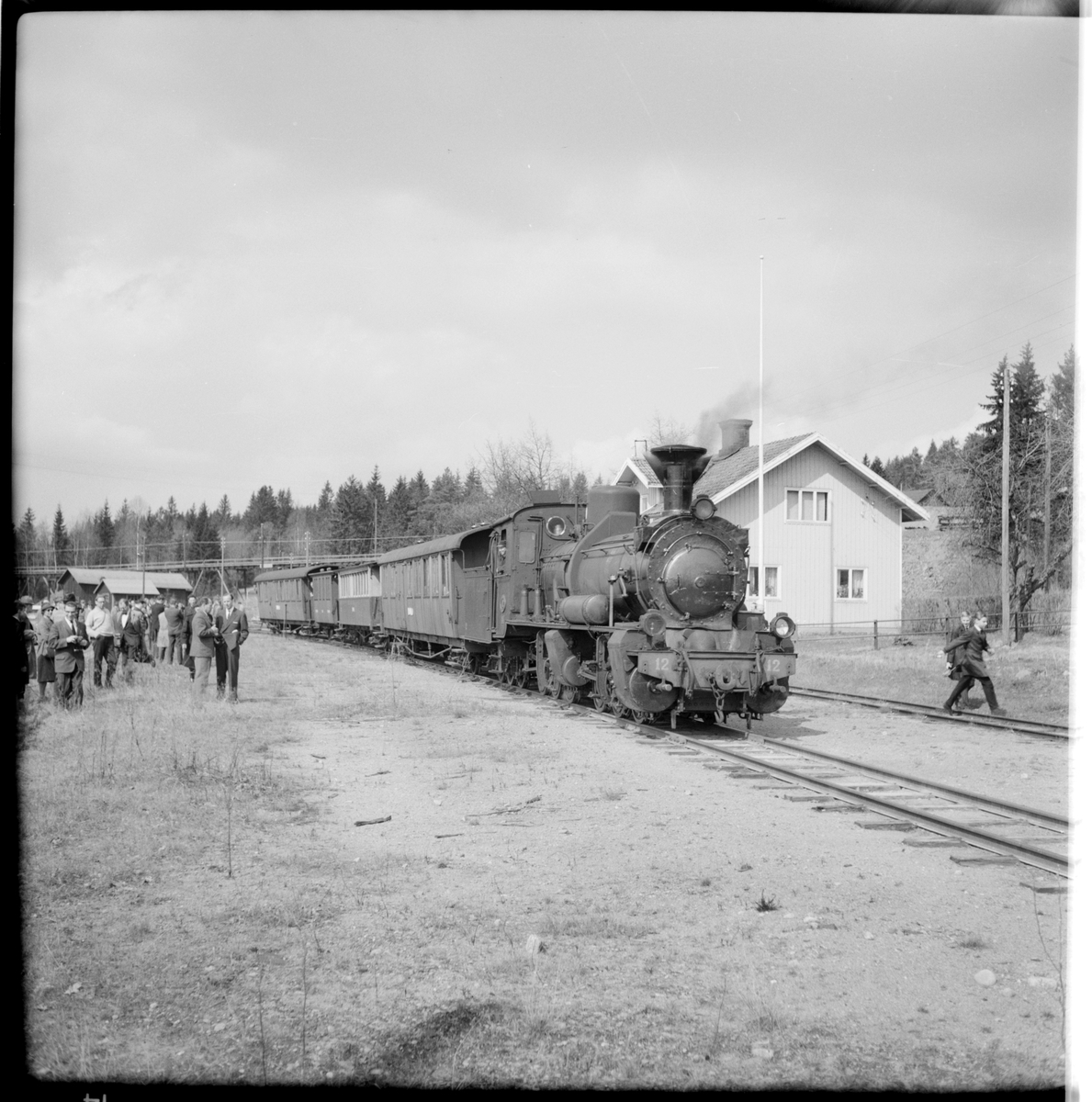 Åskådare bredvid Dala - Ockelbo - Norrsundet Järnväg, DONJ lok 12 vid stationshuset i Vintjern.