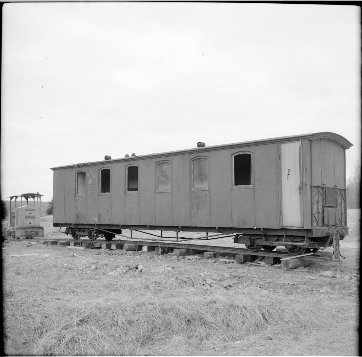 Skrotfärdig Nättraby - Alnaryd - Älmeboda Järnväg, NAEJ personvagn uppställd på provisorisk järnväg. Framför vagnen ses ett industrilok.