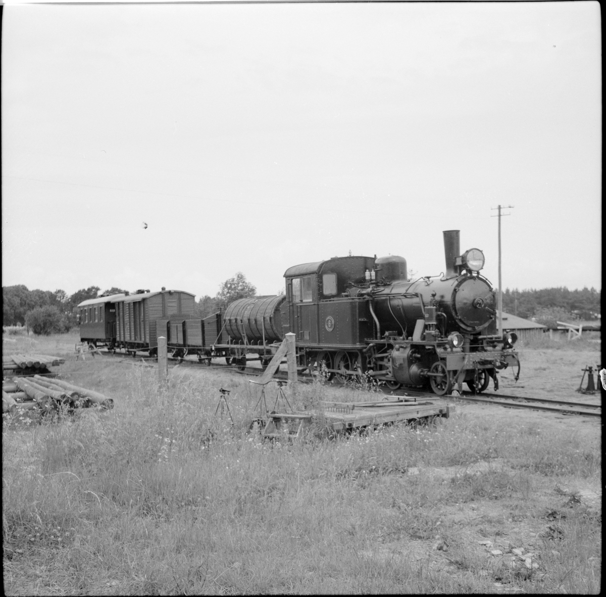 Museijärnväg med ångtåg och lok 6. Dressin ses mitt i bild bland ogräset.