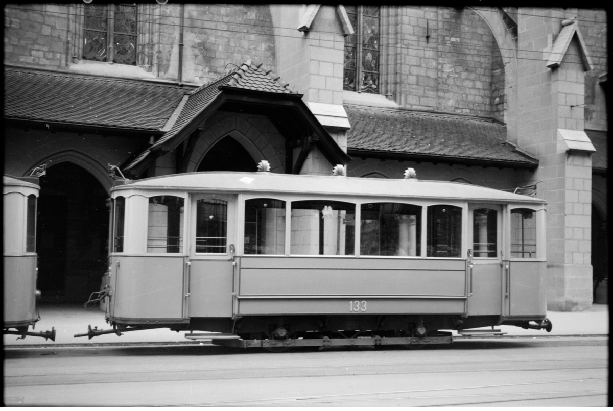 Utanför Église Saint-François kyrka på Place Saint-Francois står släpvagn 133 i Lausanne.