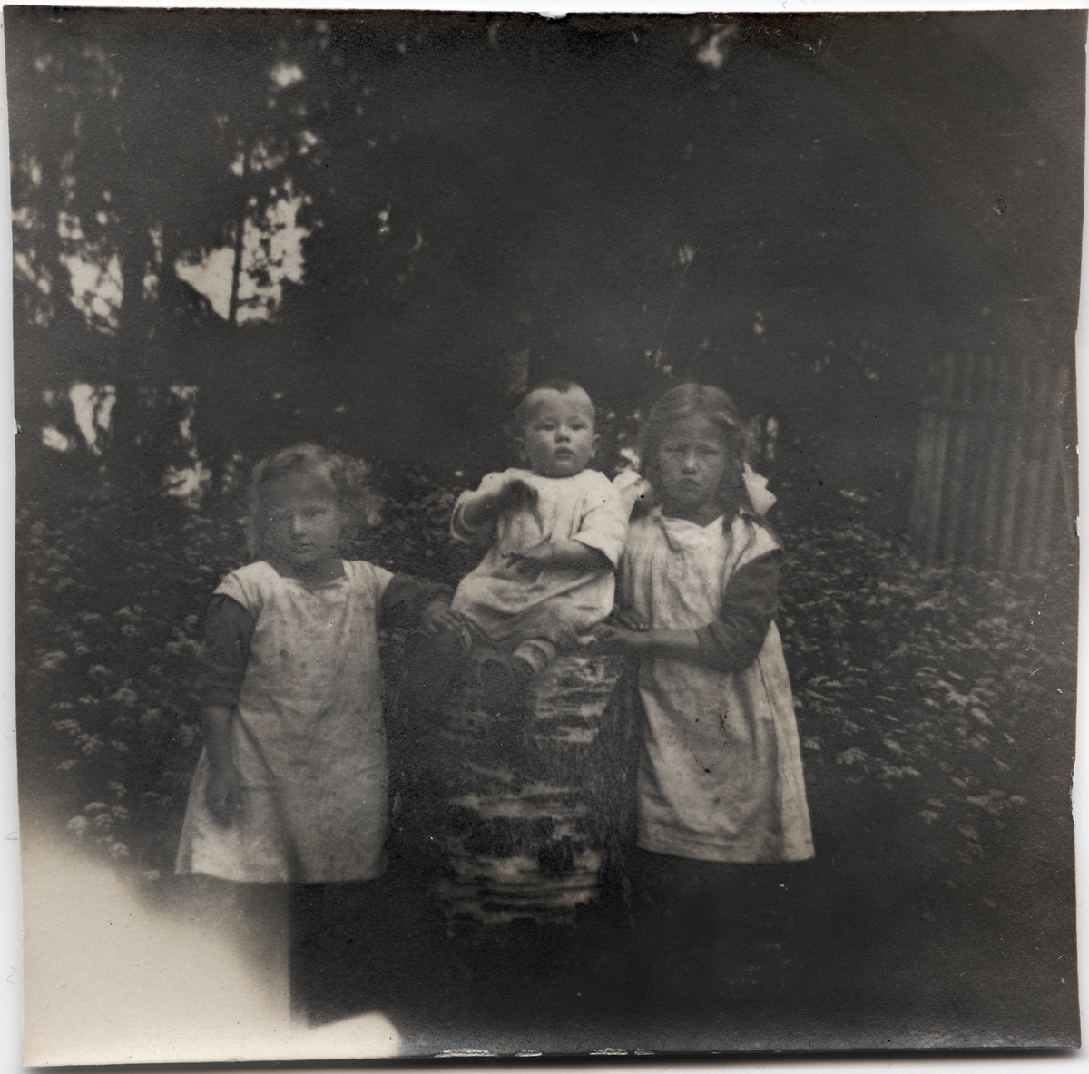 Första året i Långsjön. Barnen Andersson från vänster: Astrid, Ingemar, sittandes på en björkstubbe, och Ingrid.
