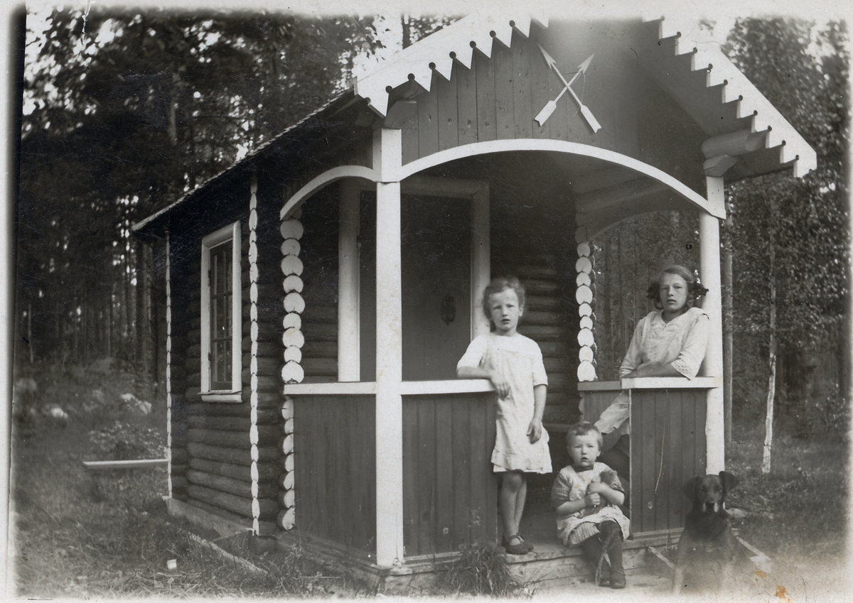 Barnen Andersson vid lekstugan i Långsjön. Från vänster Siri 5 år, Ingeborg 2 år, Astrid 14 år och familjens hund Gissa.