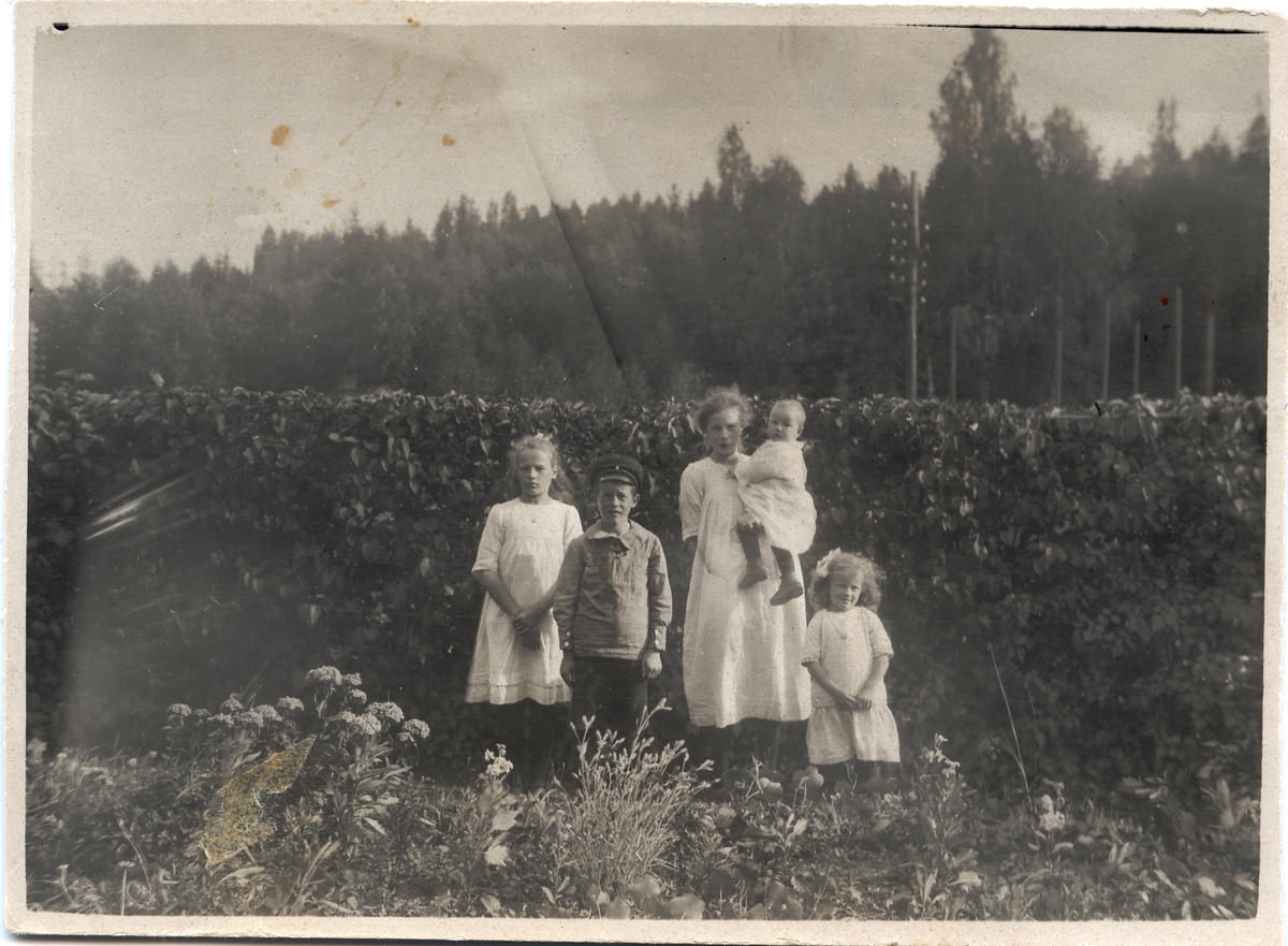 Alla fem barnen till Per Erik och Tekla Andersson i Långsjön står uppställda för fotografen. Från vänster: Astrid, Ingemar, Ingrid, lilla Ingeborg och Sigrid "Siri".