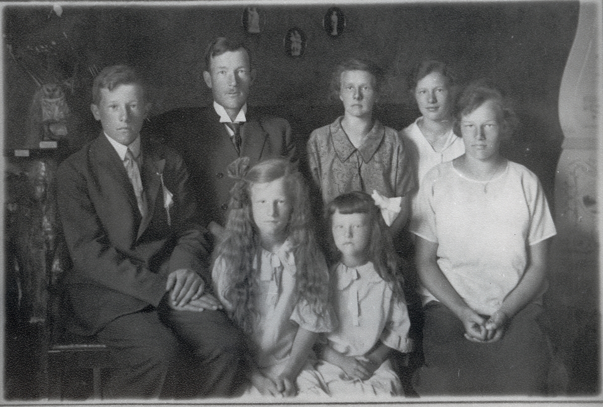 Gruppfoto av familjen Andersson. Eventuellt taget i samband med Långsjö-Pelles 40 års dag! Långsjö-Pelle var stationskarlsförman vid Långsjön under åren 1913-1945. Bakre raden från vänster: Långsjö-Pelle, Per Erik Andersson, Tekla Andersson och Ingrid Andersson. Främre raden från vänster: Ingemar Andersson (senare Aldenby), Sigrid Siri Andersson, Ingeborg Andersson och Astrid Andersson.
