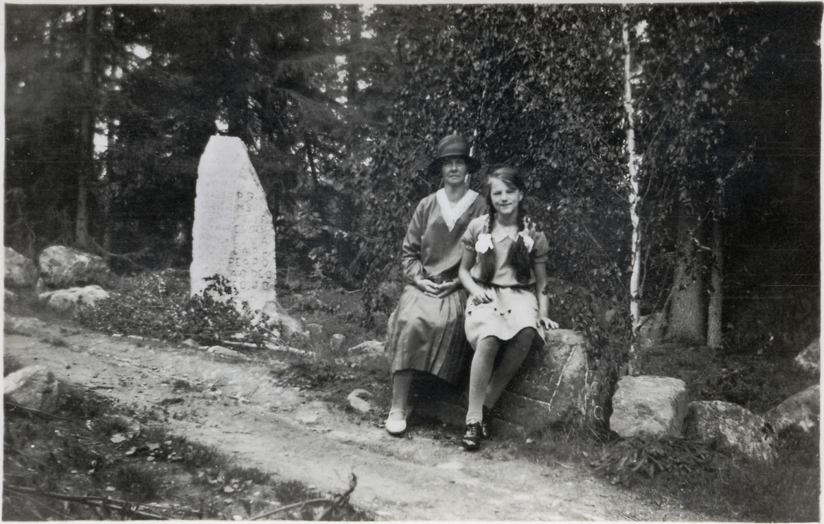 Vilostenar vid Lunds fäbodar. Tekla Andersson och yngsta dottern Ingeborg på en av vilostenarna.