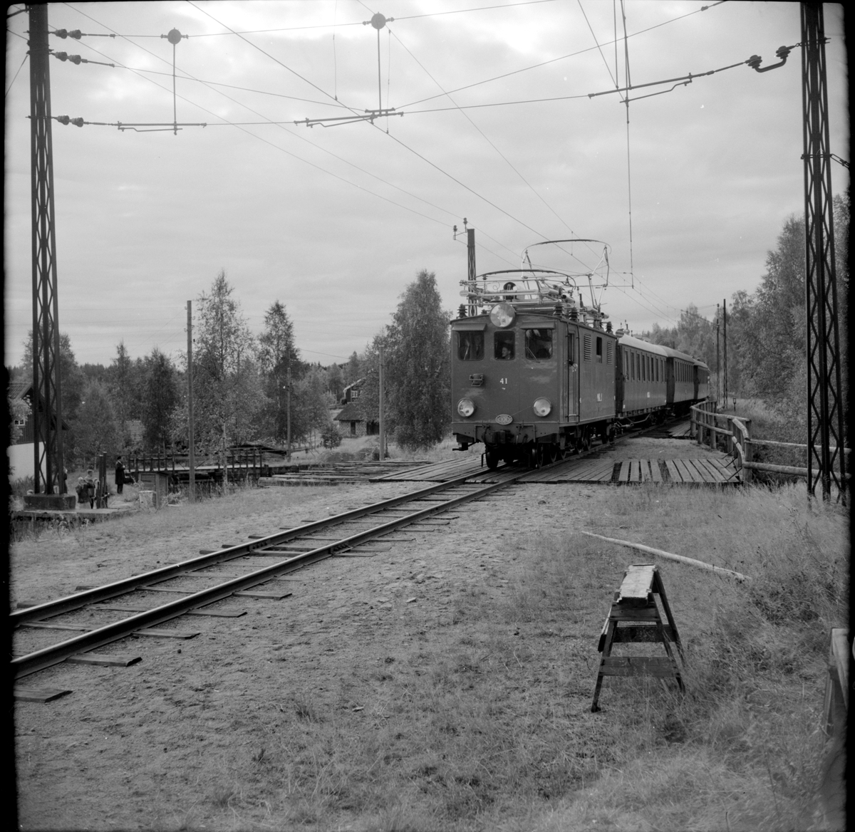 Persontåg bestående av Nordmark - Klarälvens Järnväg, NKIJ ellok 41och tre personvagnar. Besökare från Svenska Järnvägsklubben, SJKs höst resa på NKIJ skymtar till vänster i bild.