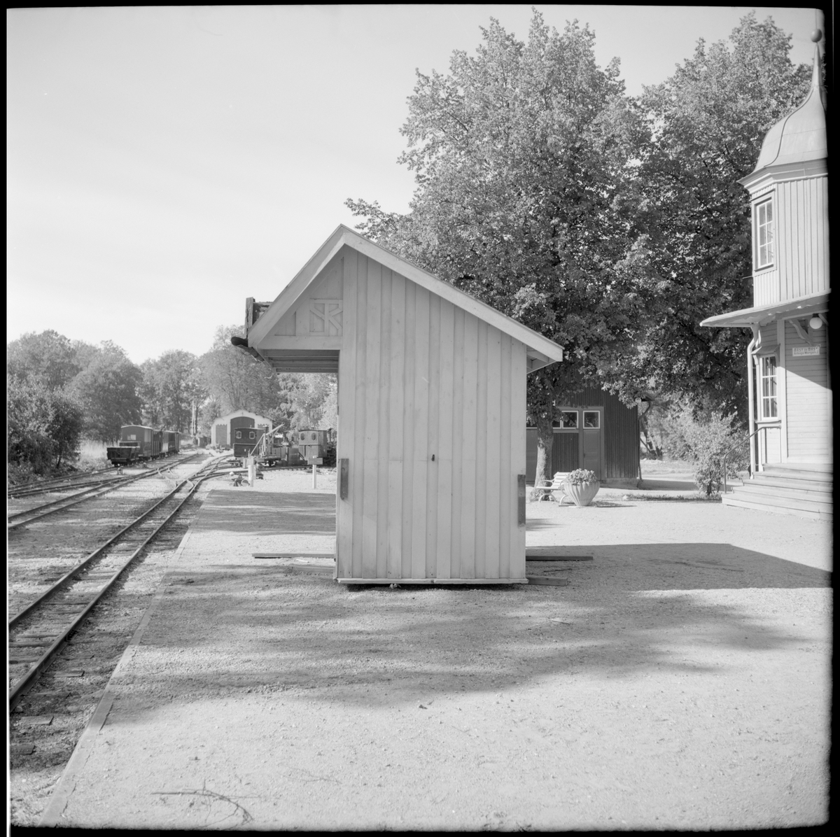 Stationhuset i Mariefred samt kuren från Löt hållplats ståendes på plattformen. Till vänster i bild ses ånglok, vagnar och lokstall som användes av Museijärnväg Östra Södermanlands Järnväg, ÖSlJ.