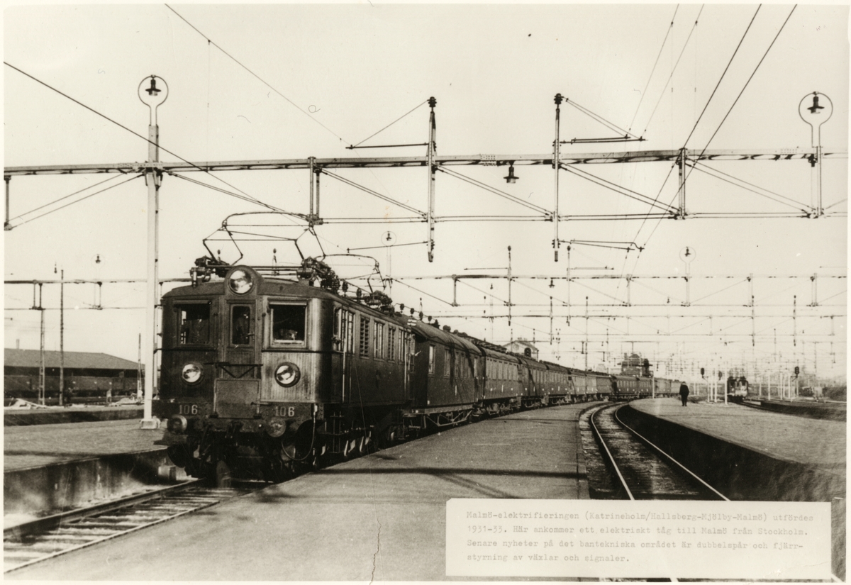 Persontåg driven av ellok ankommer till Malmö från Stockholm. Statens Järnvägar, SJ D 106.